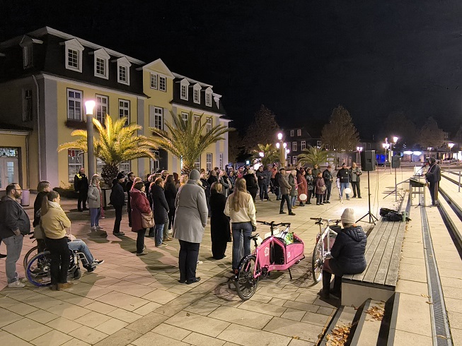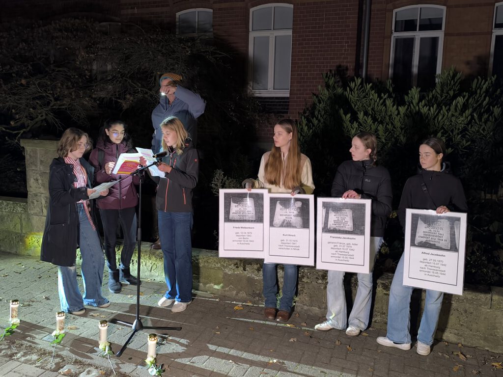 Der Einladung von „Bad Nenndorf ist bunt“ zum Gedenken an die faschistischen Novemberpogrome von 1938 folgten am 9. November 2023 ca. 130 Menschen. Der Zug der Erinnerung begann um 17 Uhr in der Hauptstraße 27, an den Stolpersteinen für Jeanette Apolant und Franziska Kahn, mit musikalischen Beiträgen von Schülerinnen der CJD-Schule. Nach einleitenden Worten von Jürgen Uebel (BNib) trugen Schüler*innen des Gymnasiums Bad Nenndorf Auszüge aus den Biographien der beiden aus Bad Nenndorf vertriebenen und 1942 im KZ Theresienstadt ermordeten jüdischgläubigen Schwestern vor. Dr. Sebastian Sievers verlas für die evangelische Kirchengemeinde ein Gebet, bevor Ludmilla Nekrassova für die Jüdische Gemeinde Schaumburg das Kaddisch sprach.